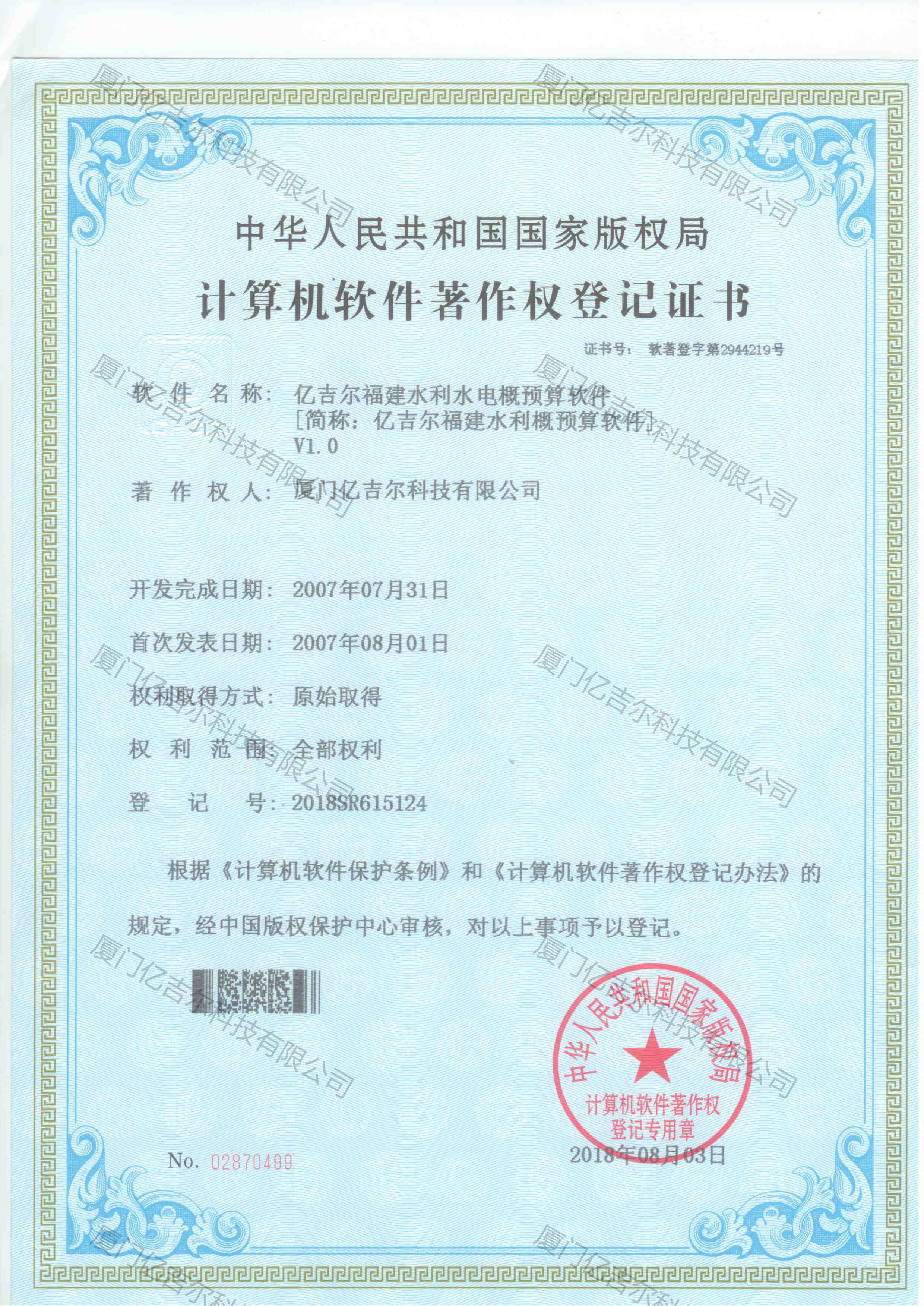 億吉爾福建水利水電概預(yù)算軟件著作權(quán)登記證書(shū) 發(fā)布日期:2018年08月03日 瀏覽次數(shù):4112 關(guān)鍵字: 公司 1/1億吉爾福建水利水電概預(yù)算軟件著作權(quán)登記證書(shū)