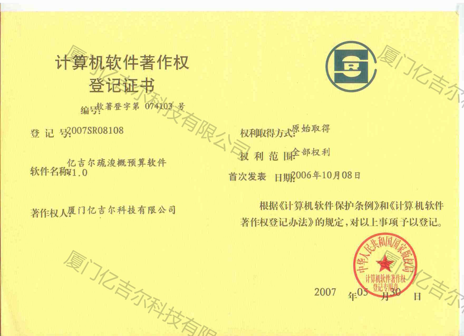 億吉爾疏浚概預(yù)算軟件著作權(quán)登記證書(shū) 發(fā)布日期:2007年05月30日 瀏覽次數(shù):4021 關(guān)鍵字: 公司 1/1億吉爾疏浚概預(yù)算軟件著作權(quán)登記證書(shū)