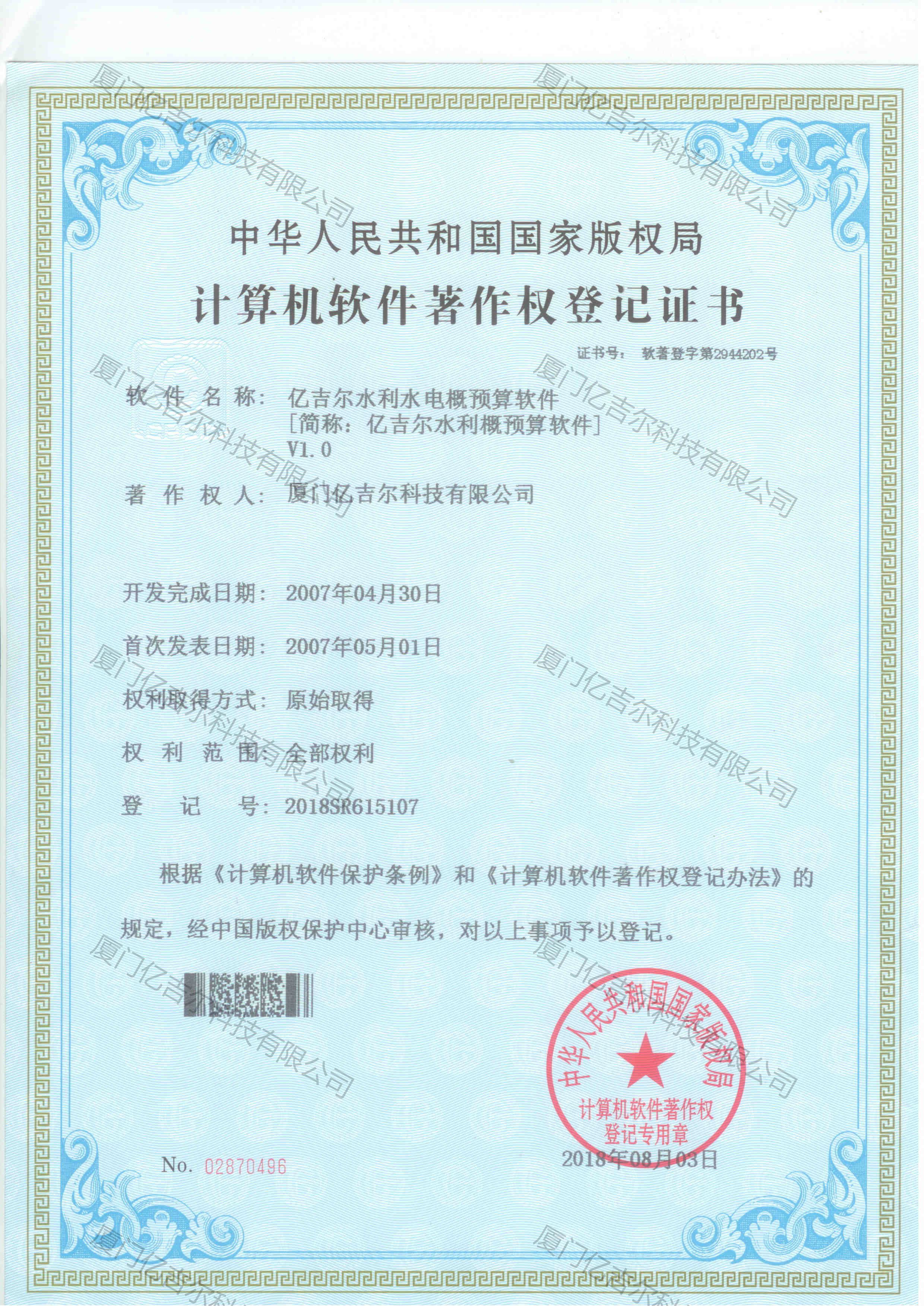 億吉爾水利水電概預(yù)算軟件著作權(quán)登記證書 發(fā)布日期:2018年08月03日 瀏覽次數(shù):4050 關(guān)鍵字: 公司 1/1億吉爾水利水電概預(yù)算軟件著作權(quán)登記證書