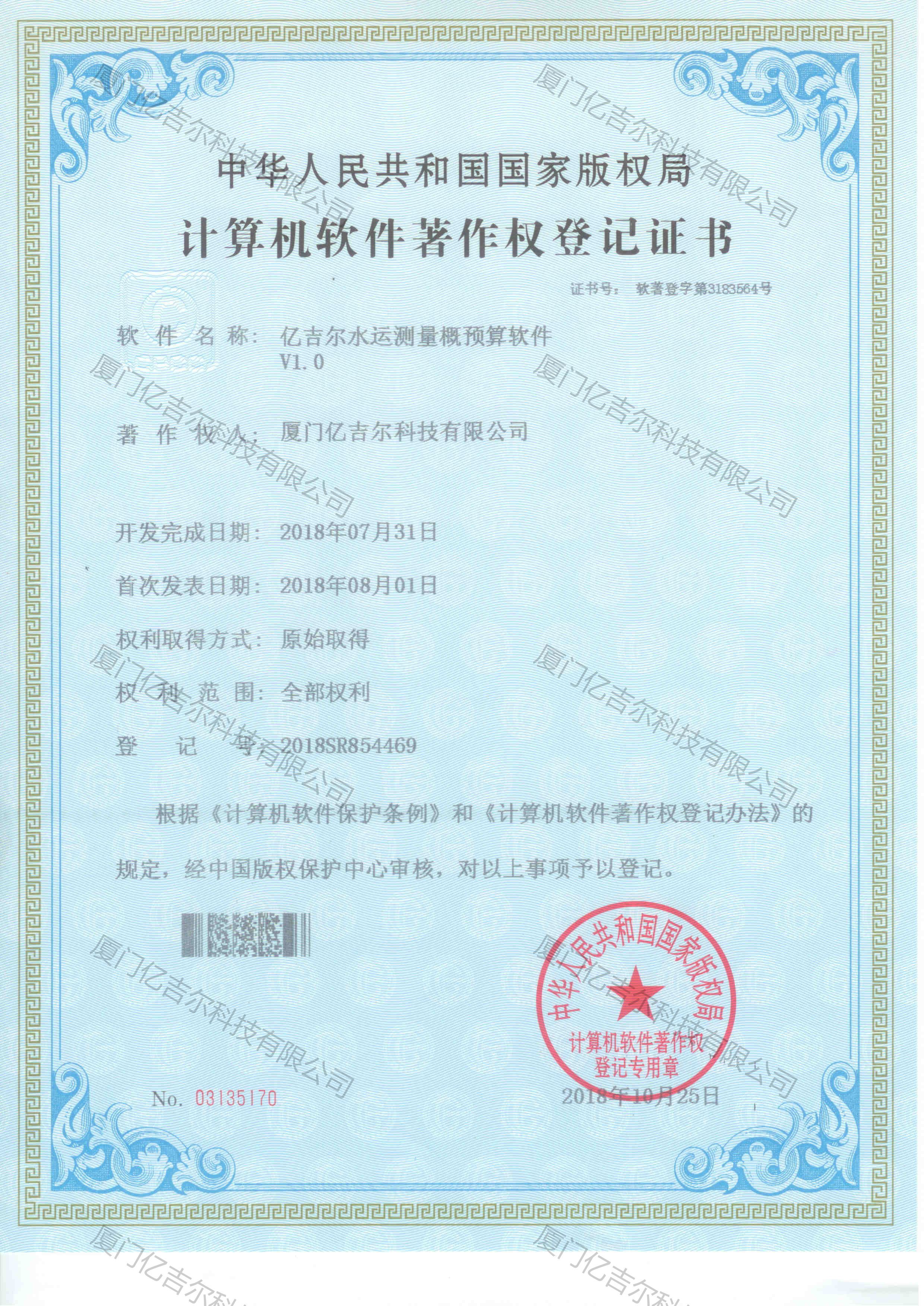 億吉爾水運測量概預算軟件著作權(quán)登記證書 發(fā)布日期:2018年10月25日 瀏覽次數(shù):4364 關(guān)鍵字: 公司 1/1億吉爾水運測量概預算軟件著作權(quán)登記證書