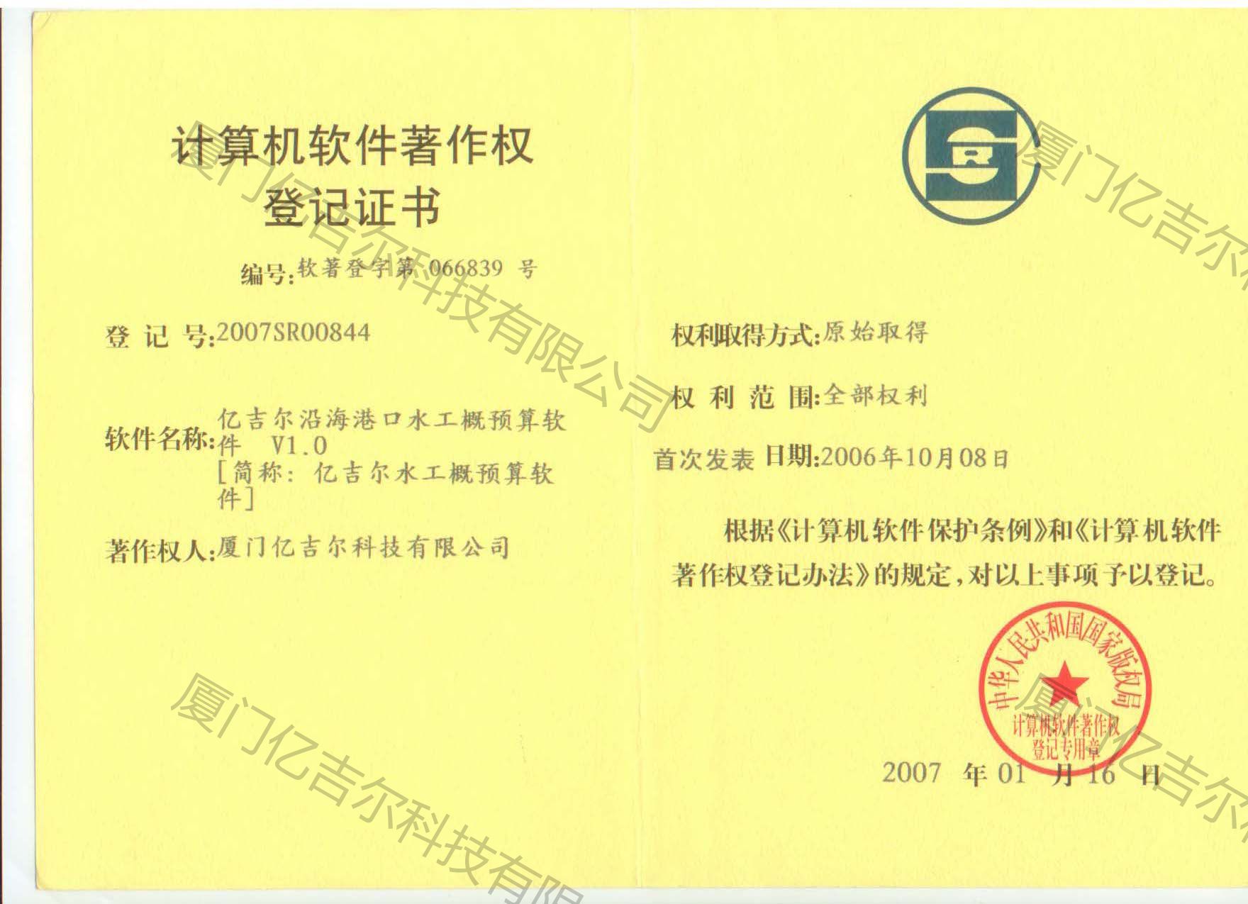 億吉爾沿海港口水工軟件著作權(quán)登記證書 發(fā)布日期:2007年01月16日 瀏覽次數(shù):4119 關(guān)鍵字: 公司 1/1億吉爾沿海港口水工軟件著作權(quán)登記證書